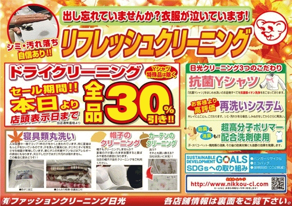 11月セール情報!!お得な割引クリーニング品30%OFF 11月25日(火)〜12月7日(日)まで|クリーンング日光|府中・多摩・八王子のクリーニング